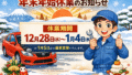 12月28日から1月4日までお休みさせていただきます。ご不便をおかけしますが、よろしくお願いいたします。お忙しい時期かと思いますが、皆様どうぞお体ご自愛くださいませ1月5日より平常営業いたします。